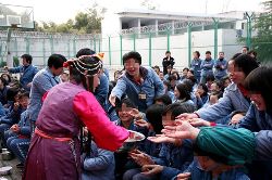 3月4日是藏歷木馬年正月初三,成都女子監(jiān)獄的藏族服刑人員穿戴起節(jié)日的盛裝,和走入高墻的西南民院師生們共度藏歷新年。篝火熊熊,歡樂的鍋莊,服刑人員、民警、師生們一同舞蹈,一同歡笑。