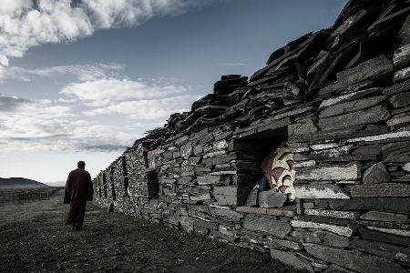 走近了,你會(huì)看見(jiàn)砌墻的石片上刻著密密麻麻的經(jīng)文;綿延的墻體上嵌著一個(gè)個(gè)窗口式的佛龕;每隔一段距離,石墻圍出一個(gè)回環(huán)的空間,類(lèi)似于城墻上的烽火臺(tái);長(zhǎng)墻的兩端立著高大的佛塔,中段的108座佛塔排成長(zhǎng)長(zhǎng)的隊(duì)伍,和長(zhǎng)墻并行。