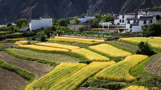 清晨,瓦藍(lán)瓦藍(lán)的天空云霧繚繞,周?chē)木拔镆黄鼥V,就好像童話(huà)里的仙境,一會(huì)兒,太陽(yáng)從東邊冉冉升起,霧也漸漸消失,村子里屋頂上飄著裊裊煨桑的煙子,我站在山岡上從高處向下俯望,只見(jiàn)高山峽谷之中,層層翠綠的梯田簇?fù)碇l(xiāng)城特有的白藏房,山下的田野,就像一片金色的海洋,將秀麗的田園裝扮得更加如詩(shī)如畫(huà)。一陣晨風(fēng)吹過(guò),麥田上蕩起了一道道金色的波紋,遠(yuǎn)處傳來(lái)了畫(huà)眉鳥(niǎo)的歌聲,我被眼前的一切迷住了,仿佛一切都靜止了,她讓我的夢(mèng)從這里開(kāi)始。
