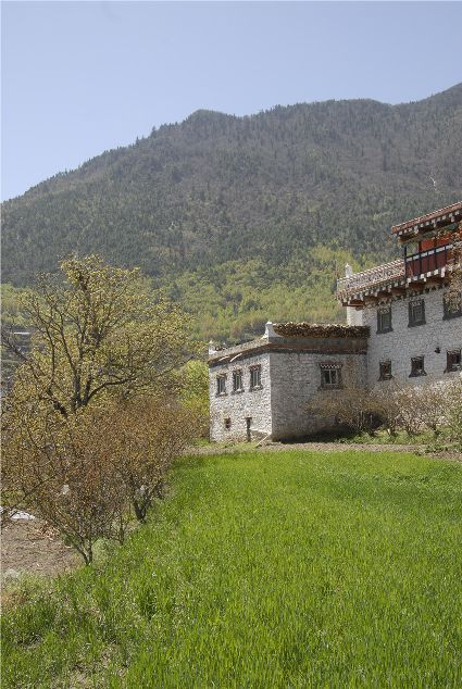 丹巴縣梭坡鄉(xiāng)為大渡河第一鄉(xiāng),大渡河由此匯集了丹巴縣境內(nèi)的大金河、小金河、東谷河、革什扎河,旖旎而去。四月,大渡河帶來(lái)充沛的雨量,在梭坡鄉(xiāng)兩岸高山之巔,綠色正在點(diǎn)染土地、房屋、人們的笑容以及湛藍(lán)的天空。