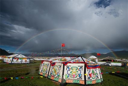 7月31日,石渠縣扎溪卡大草原上,藍(lán)天、白云與草地、帳篷相互映襯。