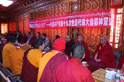 宣講團成員勇勇用藏語激情洋溢的宣講黨的十九大精神,現(xiàn)場不斷響起熱烈的掌聲。當(dāng)勇勇講到我國五年來取得的輝煌成就時,僧人們都激動不已,紛紛為發(fā)展成就點贊?!奥犃私裉斓男v,我進一步了解到了我們國家這些年來取得的發(fā)展成就。一直以來,黨對我們的關(guān)懷是看得見摸得著的,現(xiàn)在我們的寺廟管理越來越規(guī)范,基礎(chǔ)設(shè)施也得到了完善,通往寺廟的道路也有了明顯改善,我們的生活越來越好了,這一切都是共產(chǎn)黨的功勞?!彼聫R僧人尺乃表達著對黨的感恩。