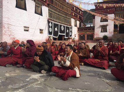 當(dāng)宣講組一行來到郭沙寺時,寺廟僧人們早已迫不及待的等候在寺廟外。“聽說你們今天要來,我們?nèi)律舷露己芨吲d、很期待?!彼聫R堪布甲它激動地說。