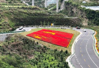 7月1日是中國共產(chǎn)黨98周歲的生日。四川甘孜藏族自治州瀘定縣用23萬多株鮮花,在雅康高速路瀘定連接線出口處擺了鮮紅的黨旗、國旗造型,以此表達對黨的感情。