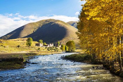 車沿著川藏公路南線前行,一條淺淺的小河與公路相依相偎地蜿蜒流淌。此時的新都橋,金燦燦的山野,不打折的黃金季節(jié),美得不要不要的。