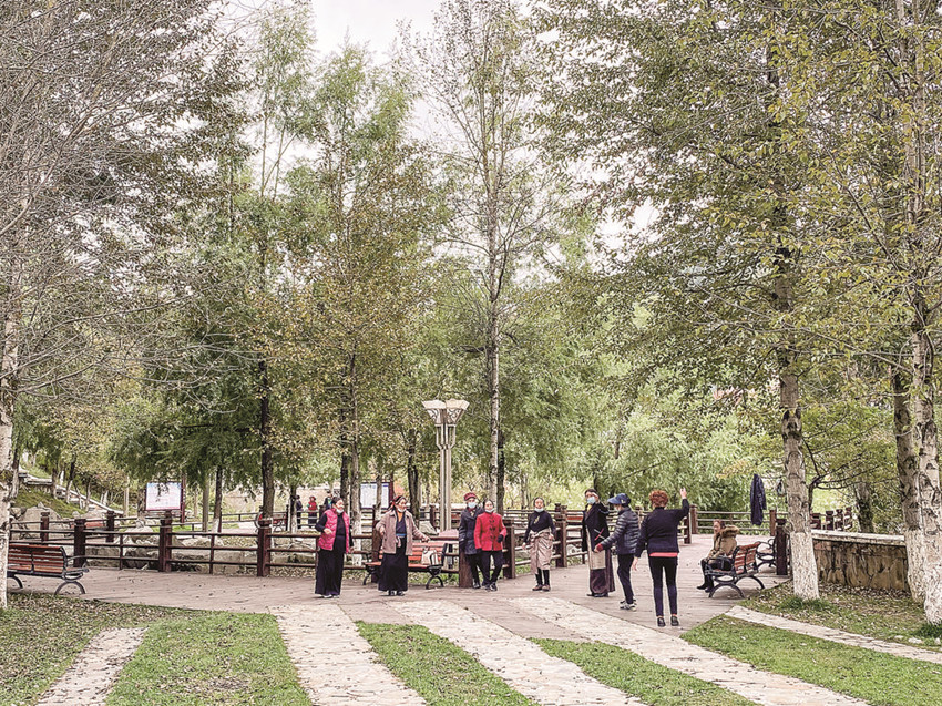 圖為老人們?cè)谇楦韫珗@跳廣場舞。記者 格桑土登 攝