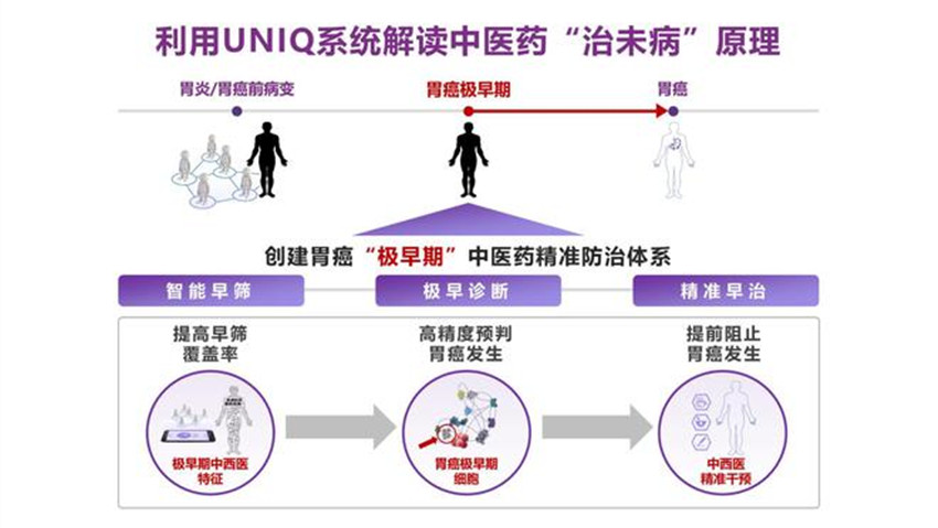 利用UNIQ系統(tǒng),結(jié)合大規(guī)模臨床病例的采集和檢測,李梢?guī)ьI(lǐng)團(tuán)隊(duì)發(fā)現(xiàn)了胃癌“極早期”這一全新的階段,中醫(yī)上主要表現(xiàn)為本虛標(biāo)實(shí)、寒熱失衡。從中醫(yī)典型病例中還發(fā)現(xiàn)寒、熱舌苔菌群等新型標(biāo)志物,尤其是首次構(gòu)建了胃炎癌轉(zhuǎn)化的單細(xì)胞網(wǎng)絡(luò),發(fā)現(xiàn)了與胃早癌細(xì)胞高度接近的胃癌極早期細(xì)胞。經(jīng)2700余例胃炎癌轉(zhuǎn)化序貫病例樣本驗(yàn)證,發(fā)現(xiàn)該標(biāo)志物能夠使得胃癌發(fā)生的預(yù)判提前10個(gè)月,準(zhǔn)確率達(dá)85%。探測出的胃癌極早期細(xì)胞如果處于萌芽期,進(jìn)行中藥干預(yù)就可能延緩甚至阻斷其癌變,有望為解決我國胃癌早診率低的難題提供突破口。