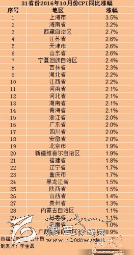 31個(gè)省份中,上海10月份CPI漲幅全國(guó)最高,為3.5%,漲幅比9月回落0.1個(gè)百分點(diǎn)。其次是海南,漲幅為3.2%。上海、海南也是目前全國(guó)兩個(gè)CPI漲幅處于“3時(shí)代”的地區(qū)。
