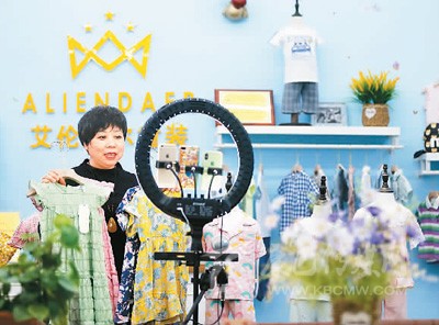 5月15日,位于山東省青島市即墨區(qū)的青島艾倫達爾服飾有限公司營銷人員通過云直播推介產品。