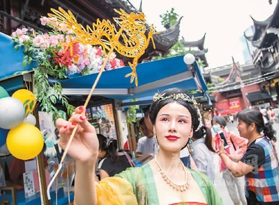 前不久,上海豫園打造的沉浸式國潮主題街區(qū)——“食玩校場”開啟,國潮品牌、大牌美食、網(wǎng)紅零食、環(huán)球輕食、潮流手辦、超級IP衍生品齊聚,充滿了煙火氣。圖為一名身著漢服的女生展示可以吃的糖畫。