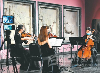 在西安碑林博物館昭陵六駿石刻前,西安交響樂團(tuán)“弦上莫奈四重奏”為“云上國寶”音樂會(huì)彩排。