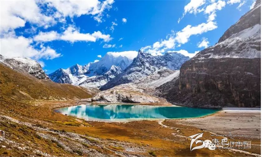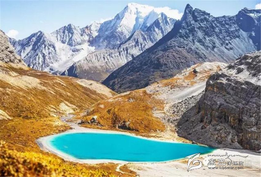 三神山中間的牛奶海,美麗的高原堰塞湖,面積0.5公頃,海拔4500米,四周雪山環(huán)繞,湖水清瑩碧藍(lán),山上成瀑,以其玲瓏秀雅水色翠藍(lán)而著名,牛奶海上方有大片的冰川。傳說(shuō)每年春暖花開(kāi)之時(shí),湖水會(huì)像牛奶一樣潔白如瓊漿,并因此得名牛奶海。