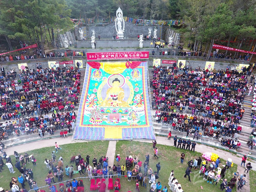 早上6點,跑馬山索道入口已聚集了不少群眾;上午8點,跑馬山情歌坪已被圍得水泄不通;上午9點,“四月八”曬佛儀式正式開始。伴著悠揚的佛陀吟誦和裊裊的煨桑香煙, 巨型釋迦牟尼佛像緩緩揭開蓋簾布展現(xiàn)在陽光之下;成群的青年男女向佛像投去代表祝福和敬意的哈達(dá),虔誠的信徒向其朝拜、叩首。整個過程肅穆而莊嚴(yán)。