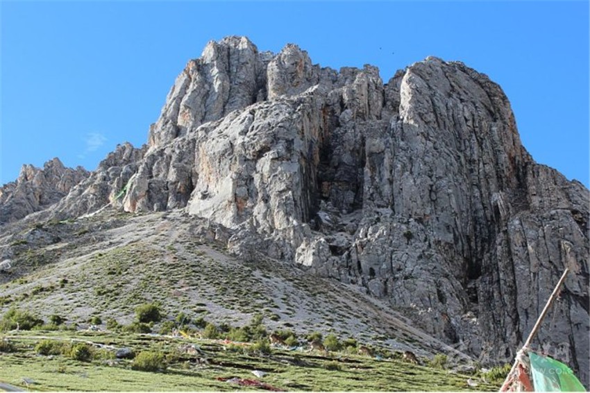 扎嘎神山又名為朗郎神山。神山山頂裸露,紅白相間的花崗石壘積形成數(shù)座山峰。主峰海拔4600米,如刀砌斧劈,險峻雄偉,直指云霄。傳說中文殊、金剛手、觀世音、法王松贊干布祖孫三代、蓮花生大師等眾多神靈曾經蒞臨此山,留有許多圣跡,故名揚藏區(qū)。