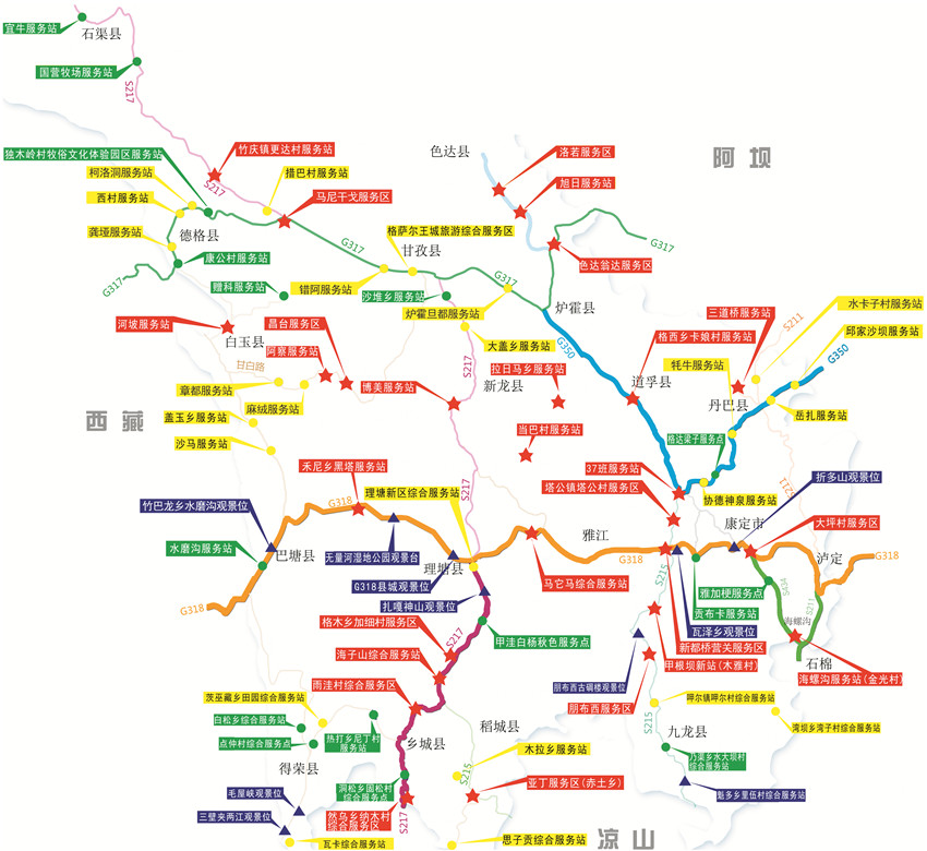 77個服務(wù)區(qū)(站、點)地處我州六條旅游線路和十條景觀大道。主要集中在:G318線(瀘定——康定——雅江——理塘——巴塘),G350線(丹巴——八美——道孚——爐霍——色達(dá)),S217線(理塘——稻城——香格里拉鎮(zhèn)——亞?。琒211線、S434線(瀘定——海螺溝——榆林)。