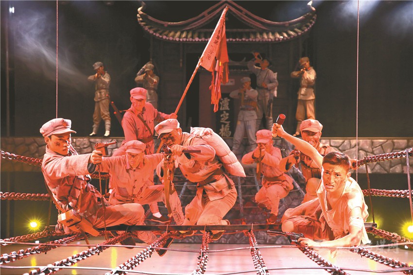 本網(wǎng)訊 在身著紅軍服、打著“火把”的戰(zhàn)士的引領(lǐng)下,觀眾緩緩而行,在經(jīng)歷一場(chǎng)激烈的戰(zhàn)斗后,大家走過(guò)銷煙彌漫的戰(zhàn)場(chǎng),來(lái)到實(shí)景劇場(chǎng),以一位“親歷者”的身份“穿越”至歷史的場(chǎng)景。幽深的河谷、洶涌的波濤、兇殘的敵人、英勇的戰(zhàn)士、激烈的戰(zhàn)斗……隨著劇情的展開(kāi),讓人親臨其境84年前那場(chǎng)驚天動(dòng)地的重要戰(zhàn)役——《飛奪瀘定橋》。