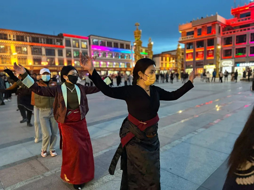 本網(wǎng)訊 每到傍晚時分,色達的金馬廣場上都會準時響起起歡快的鍋莊曲。 舞者們雙手隨音樂自然張開,邁著輕快的步伐,踢腿、揚手、轉(zhuǎn)圈。游客們有的拿起手機拍照留念,有的則加入鍋莊舞的隊列。