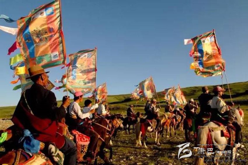 藏歷五月初四,就是色達牧民的祭神節(jié)。這天,牧民們在各色布上印上象征福氣的經(jīng)文,在經(jīng)旗周邊裝飾上白、紅、黃、綠、蘭布條。男子在自己的火槍槍架上,飾以經(jīng)幡,上邊掛一緞制煙祭用的小袋騎馬趕赴節(jié)日集會地點。