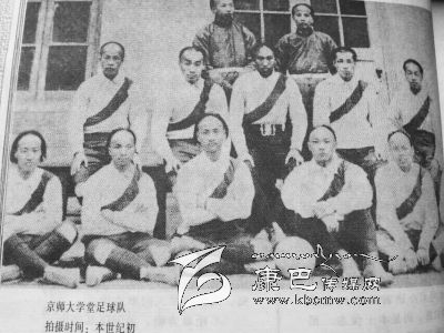 這是一張上個(gè)世紀(jì)初藏族人同英國人美國人在康巴高原踢足球的照片,地點(diǎn)是在川藏茶馬古道上的巴塘境內(nèi),從巴塘越過金沙江就是西藏地界。同樣的時(shí)間,京師大學(xué)堂(北京大學(xué)前身)建制完整的足球隊(duì)也為后人留下了一張同樣珍貴的合影照。