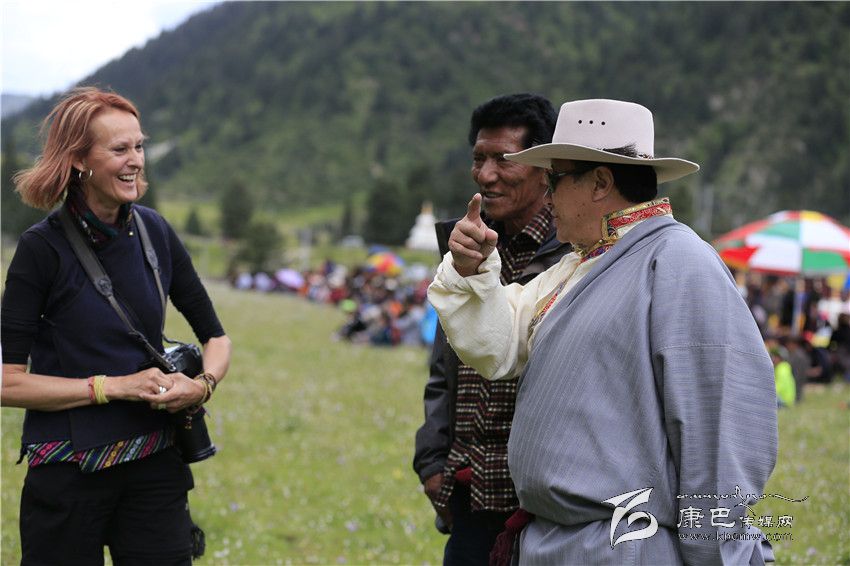 根秋扎西向國外游客介紹家鄉(xiāng)風(fēng)俗。