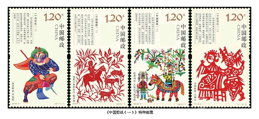 2018年1月24日,中國(guó)郵政發(fā)行《中國(guó)剪紙(第一組)》特種郵票,全套4枚。這是中國(guó)郵政繼1959年1月1日發(fā)行的《剪紙》特種郵票59年后重新發(fā)行的《中國(guó)剪紙》系列郵票。全系列郵票計(jì)劃發(fā)行4組,每組4枚。這次發(fā)行的第一組4枚郵票入選內(nèi)容分別是被列入第一批國(guó)家級(jí)非物質(zhì)文化遺產(chǎn)名錄的北方四處剪紙傳承人的作品:第一枚“河北蔚縣·蘆花蕩”,河北蔚縣剪紙歷史悠久,風(fēng)格獨(dú)特,題材多取自于人物,造型設(shè)計(jì)疏密有致,點(diǎn)染絢麗鮮艷。此幅作品作者王老賞(1890-1951),河北省蔚縣南張莊村人;第二枚“內(nèi)蒙和林格爾·牧羊圖”,內(nèi)蒙古和林格爾剪紙多反映游牧生活,具有古拙浪漫、質(zhì)樸奔放、熱情率真的藝術(shù)風(fēng)格。此幅作品作者張花女 (1903-2004),和林格爾縣董家營(yíng)鄉(xiāng)曹老八夭村人;第三枚“陜西旬邑·江娃拉馬梅香騎”,陜西旬邑的彩色剪紙具有民間美術(shù)的鮮活靈動(dòng),無(wú)拘無(wú)束,形象稚拙而又鮮明,構(gòu)圖緊密完滿(mǎn)而又單純明快,色彩對(duì)比強(qiáng)烈而又協(xié)調(diào)適度。此幅作品作者庫(kù)淑蘭(1920-2004),陜西咸陽(yáng)市旬邑縣張洪鎮(zhèn)赤道鄉(xiāng)富村人;第四枚“山西新絳·小別母”,山西新絳剪紙藝術(shù)源遠(yuǎn)流長(zhǎng),內(nèi)容豐富多彩,尤以人物見(jiàn)長(zhǎng),戲曲題材作品更為突出,構(gòu)圖簡(jiǎn)潔飽滿(mǎn)、精煉極致,粗獷中見(jiàn)典雅,簡(jiǎn)煉而不簡(jiǎn)單。此幅作品作者蘇蘭花(1906-1995),山西運(yùn)城市新絳縣澤掌鎮(zhèn)北蘇村人。