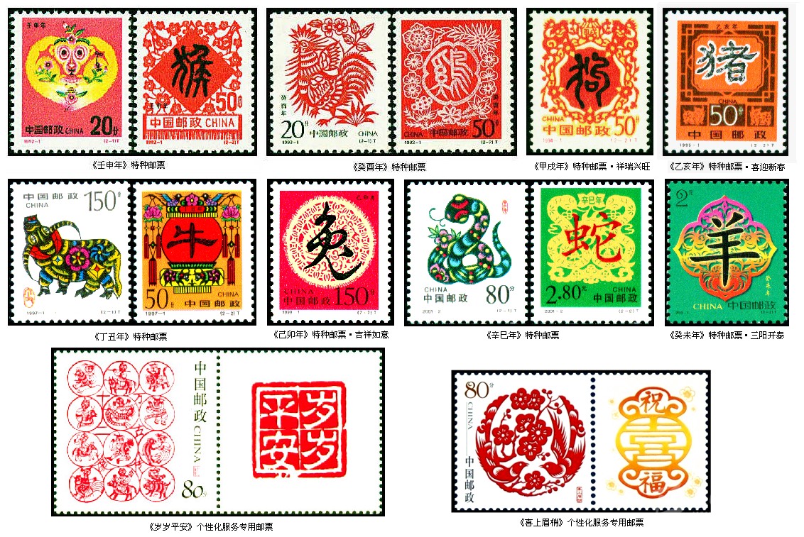 剪紙作為藝術(shù)百花園中的一朵奇葩,在我國(guó)郵票圖案設(shè)計(jì)中應(yīng)用也非常廣泛。由于傳統(tǒng)的民間剪紙有著濃郁的吉祥喜慶氣氛,因此在我國(guó)近些年發(fā)行的生肖郵票中多次出現(xiàn)剪紙藝術(shù)。在第二輪12套24枚生肖郵票中的剪紙圖案分別有1992年《壬申年》的“猴桃獻(xiàn)瑞”和“喜鵲登梅”、1993年《癸酉年》的“雄雞報(bào)曉”和“四季吉祥”、1994年《甲戌年》的第二枚“祥瑞興旺”、1995年的《乙亥年》的第二枚“喜迎新春”、1997年的《丁丑年》的“金牛奮蹄”和“牛耕年豐”、1999年《己卯年》的第二枚“吉祥如意”、 2001年《辛巳年》的“祥蛇祝?!焙汀跋檫\(yùn)普照”以及2003年的《癸未年》第二枚“三陽(yáng)開(kāi)泰”等。這些郵票中剪紙圖案有的直接取材于民間,有的則是在原作基礎(chǔ)上再創(chuàng)作。如“雄雞報(bào)曉”一枚,圖案選用的是河北省獻(xiàn)縣本齋鄉(xiāng)鄧家莊蔡蘭英老人的剪紙“百雞圖”中的一幅,而“金牛奮蹄”一枚,圖案是根據(jù)山東高密民間藝人齊秀花的剪紙“媳婦騎牛”再加工創(chuàng)作而成的。在我國(guó)發(fā)行的祝福系列個(gè)性化服務(wù)專(zhuān)用郵票中也有吉祥喜慶的剪紙圖案,即2005年11月6日的《歲歲平安》和2005年11月11日的《喜上眉梢》等。
