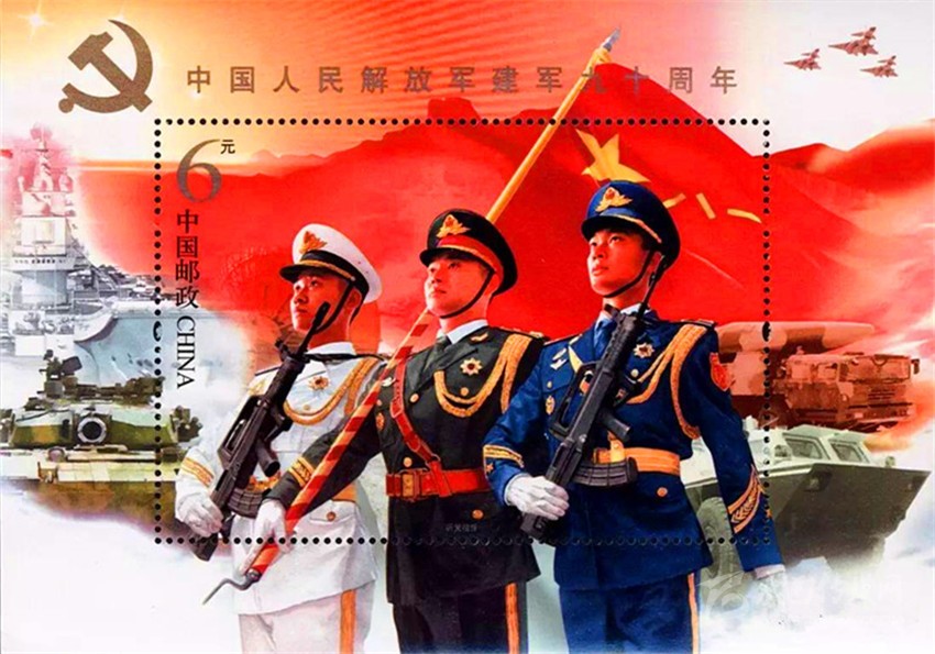 2017年8月1日,中國(guó)郵政發(fā)行《中國(guó)人民解放軍建軍九十周年》紀(jì)念郵票小型張“聽(tīng)黨指揮”(圖8)。郵票畫(huà)面上“八一”軍旗飄揚(yáng),各軍種英姿颯爽,背景襯托各軍種高尖端裝備,描繪了我軍戰(zhàn)士聯(lián)合作戰(zhàn)的畫(huà)面,既表現(xiàn)了中國(guó)人民解放軍威武雄壯的軍容和現(xiàn)代化水平,也表現(xiàn)了在黨的指揮下,人民軍隊(duì)忠實(shí)履行保衛(wèi)祖國(guó)、捍衛(wèi)和平的神圣使命。