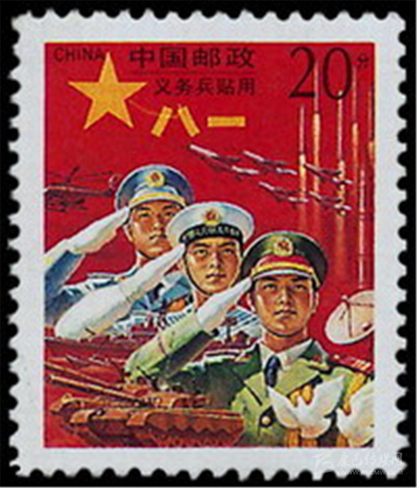 1995年8月1日,原郵電部試發(fā)行一套“義務(wù)兵專(zhuān)用”郵票一套1枚(圖5),票名為“神圣的使命”,圖案以紅光四射的“八一”軍旗為背景,以現(xiàn)代化的飛機(jī)、坦克、火箭和象征和平的白鴿為襯托,畫(huà)面是威武的陸海空三軍,顯示我軍鋼鐵長(zhǎng)城般功無(wú)不克、戰(zhàn)無(wú)不勝的精神風(fēng)貌。