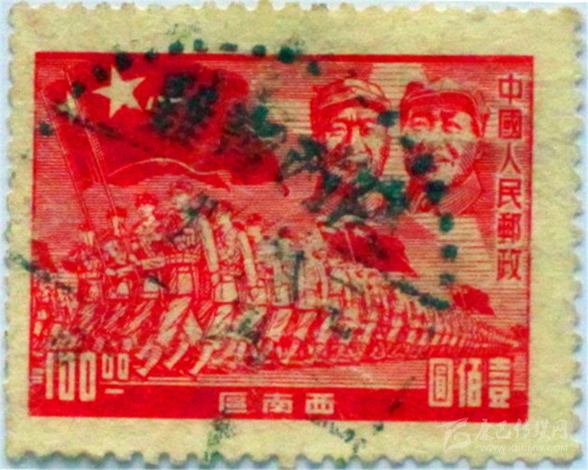 我國(guó)最早出現(xiàn)“八一軍旗”的郵票,是1949年8月1日, 剛解放的上海華東人民郵政發(fā)行的《中國(guó)人民解放軍建軍22周年》俗稱(chēng)《華東進(jìn)軍圖》郵票(圖1),一套5枚,同圖異色異值,郵票右上方為毛澤東主席和朱德總司令頭像,下方是鐵流般的人民軍隊(duì)高舉著一面面“八一軍旗”。 同年12月,西南區(qū)人民郵政又發(fā)行一套11枚圖案相同“西南進(jìn)軍圖”郵票(圖2)。