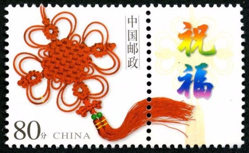 2002年5月10日,中國郵政發(fā)行《如意》個性化服務(wù)專用郵票一枚。主票圖案為如意柄端系著一個紅色“中國結(jié)”,附票有“祝?!倍?; 2003年3月3日,中國郵政發(fā)行《同心結(jié)》個性化服務(wù)專用郵票一枚。主票圖案為盤長結(jié)4邊編織有心型繩結(jié)的同心結(jié),附票為“祝?!倍?;2006年9月25日,中國郵政發(fā)行《中華全國歸國華僑聯(lián)合會成立五十周年》紀(jì)念郵票一枚。圖案為阿拉伯?dāng)?shù)字“5”與中華全國歸國華僑聯(lián)合會圓形會徽組成數(shù)字“50”,象征全國僑聯(lián)五十周年,背景畫面為淡淡的粉紅色“中國結(jié)”。寓意歸國華僑與全國人民血肉相連,同心同德共同建設(shè)美好家園;2013年8月8日,中國郵政發(fā)行一枚《美好祝?!焚R卡專用郵票,圖案為象征喜慶的紅色“中國結(jié)”;2014年9月20日,中國郵政發(fā)行《中國夢(二)——民族振興》特種郵票,其中第四枚“民族團(tuán)結(jié)”,圖案中載歌載舞的各民族群眾上方有一個大紅的“中國結(jié)”,象征著各民族大團(tuán)結(jié)。