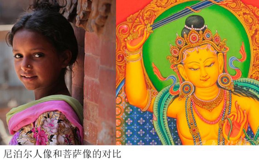 特別值得注意的是:之前佛教藝術(shù)的帕拉風(fēng)格繪畫中的臉型普遍是方正偏長的,而在尼瓦爾唐卡里,臉型普遍是方正偏短。偏短的方臉會讓五官顯得更加集中一點(diǎn),特別是眉額比較大、眼睛位置下移,這樣的感覺有點(diǎn)近似于嬰兒的面部比例。而眉骨、鼻骨高挺,又不似兒童,這樣的面部特征其實(shí)和尼國人的長相比較接近。也許是尼瓦爾人善于觀察、擅長描摹的天分,逐漸把本民族沉靜的性格與容貌,潛移默化地滲透進(jìn)了唐卡,產(chǎn)生了新的風(fēng)貌。