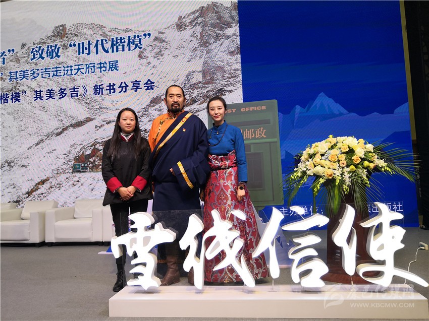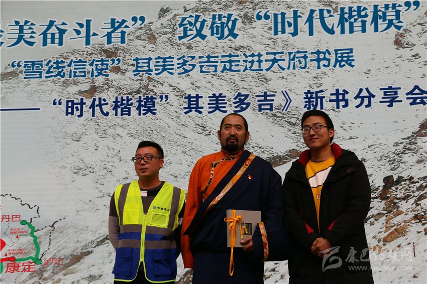 在分享會舞臺的一側(cè),靜置著書籍《雪線信使——“時代楷?!逼涿蓝嗉贩糯蠛蟮姆饷妗7饷嫔?,其美多吉、藍天與雪山相得益彰,構(gòu)成了一幅獨具特色的畫面。