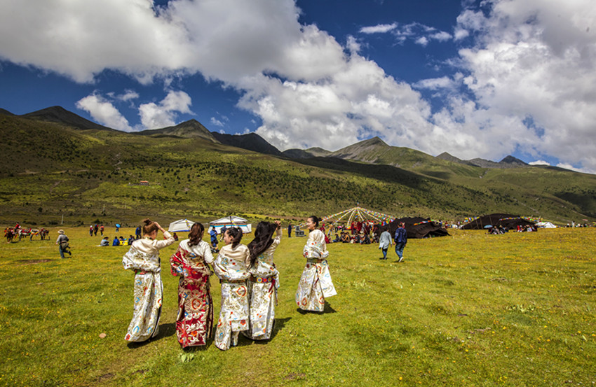 一片翡翠般的碧湖鑲嵌在谷地中央。公主梳妝的寶鏡,將美人、美景、美的念想都映在水里。九灣十八拐的“俄米曲”(牛奶河)是谷地和牛羊的母親。一溝豐盛的水草,滋潤(rùn)了多少木雅兒女!木雅花宮、花海尋蹤,公主嘉姆尊的身影隨處可見(jiàn)。