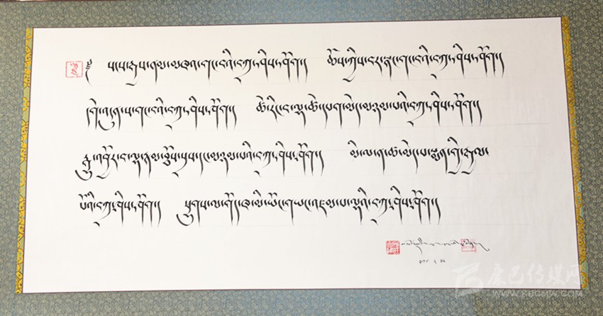 談到藏文書法作品,昂旺曲批喜歡用諸如“淳樸、干凈、善良”的字眼形容藏文書法作品的風(fēng)格。“一個字就是一個人,字有肉也有骨頭。”這是昂旺曲批對“德珍派”書法的理解,在昂旺曲批眼中,藏文字都是有生命的,需要寧心靜氣方能通過手中的筆尖,彼此呼應(yīng)。