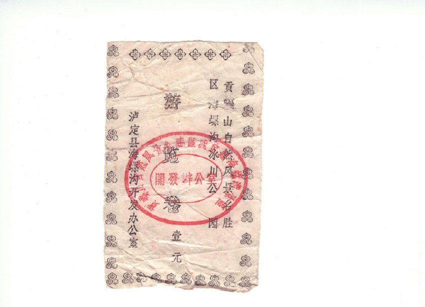 時(shí)間一晃到了7月份,海螺溝達(dá)到了“有節(jié)制接待”條件。在我向?qū)O前匯報(bào)請示,并得到同意后,七月十日將自己構(gòu)思,手工制作的海螺溝“游覽卷”樣卷送孫前過目,并獲通過。于是我買來5色紙,從瀘定縣印刷廠借來“游覽卷”三個(gè)中號印刷鉛字釘,指導(dǎo)打字員排版打印在臘紙上。游覽卷分為國內(nèi)和國外游客兩種門卷。用白、蘭、綠三色紙油印壹元面值的國內(nèi)游客門卷;黃、紅二色紙油印貳元面值的海外游客門卷。門卷規(guī)格尺寸為長9.5厘米,寬6厘米,四邊打印花邊圖案,右邊打印豎排兩行“貢嘎山自然風(fēng)景區(qū)海螺溝冰川公園”;左邊打印豎排“瀘定縣海螺溝開發(fā)辦公室”的落款;門卷正中豎印 “游覽卷”三個(gè)字,下方油印面值“壹元”或“貳元”。門卷面值充當(dāng)起游客進(jìn)海螺溝的憑證。門卷加蓋一枚雕刻繁體字“貢嘎山自然風(fēng)景名勝區(qū)瀘定縣海螺溝景區(qū)開發(fā)辦”的紅印章。門卷出售第一天就順風(fēng)順?biāo)?。?jù)1987年8月17日海辦《情況簡報(bào)》第二期記載:1987年7月14日海螺溝門票站在磨西中街掛牌成立。當(dāng)日出售給成都石化廠5名有獎(jiǎng)旅游職工壹元國內(nèi)卷5張,15日出售15張國內(nèi)門卷。到7月最后一天,半個(gè)月售出國內(nèi)門卷146張。游客來自上海、南京、西安、北京、昆明、廣東、成都、重慶。《海螺溝旅游志》(1984—1995)中記載,海螺溝門卷從1987年7月14日啟用,當(dāng)年售出門卷1219張,其中國內(nèi)卷1169張,海外卷50張,旅游綜合效益4.87萬元。
