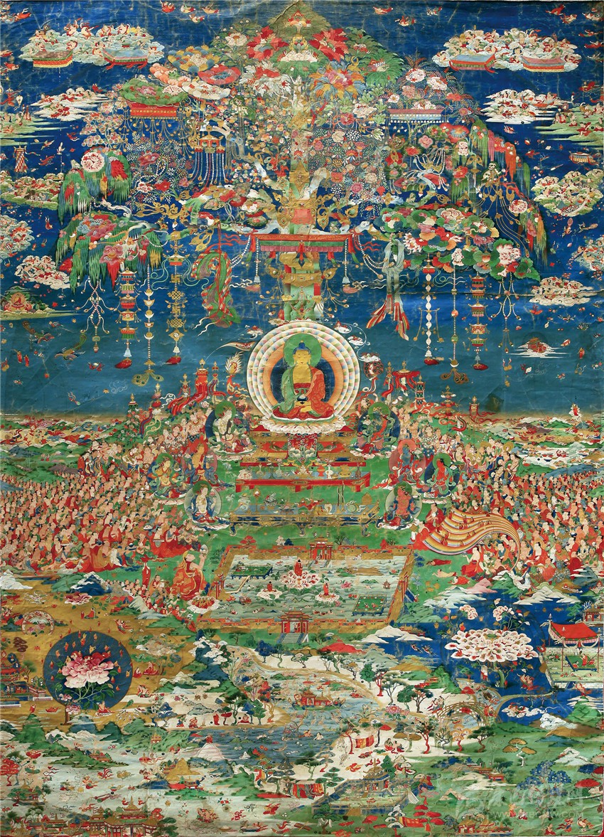 具有超越凡人的精微刻畫能力,也使得郎卡杰在面對畫布時(shí),有更廣大的空間來展示他的繪畫天賦。從存世的作品《無量光佛凈土》中,看得出郎卡杰喜歡將自己的“毫毛畫師”的能力發(fā)揮到極致。不管是花紋、瓔珞、還是人物,但凡是畫面上出現(xiàn)的物象,他都會以精致、繁密的形式出現(xiàn)。所以他的畫面世界里往往都是人山人海、琳瑯滿目;盈寸之間,容納萬千;場面浩瀚、氣勢恢宏、不可思議!