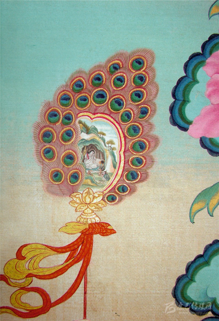 當(dāng)然,我們可以從存世的作品上印證他的這種能力。比如是在《如意寶藤之釋迦牟尼》中:左側(cè)侍女手持一把孔雀羽扇,在羽扇的中央是一塊約四平方厘米的畫屏;在這個(gè)小小的空間里面,郎卡杰描繪了一幅微縮的《修行圖》,圖中米拉日巴正在洞中苦修,洞口蹲伏著獵犬、鹿和獵人。畫中動物與人結(jié)構(gòu)準(zhǔn)確,五官準(zhǔn)確,須發(fā)清晰,衣紋細(xì)密流暢;山洞上的樹木能區(qū)分出樹干和樹葉;天空的白云有遠(yuǎn)近層次。在這不足盈寸的空間里,用毛筆刻畫這般細(xì)致,令人嘆為觀止。
