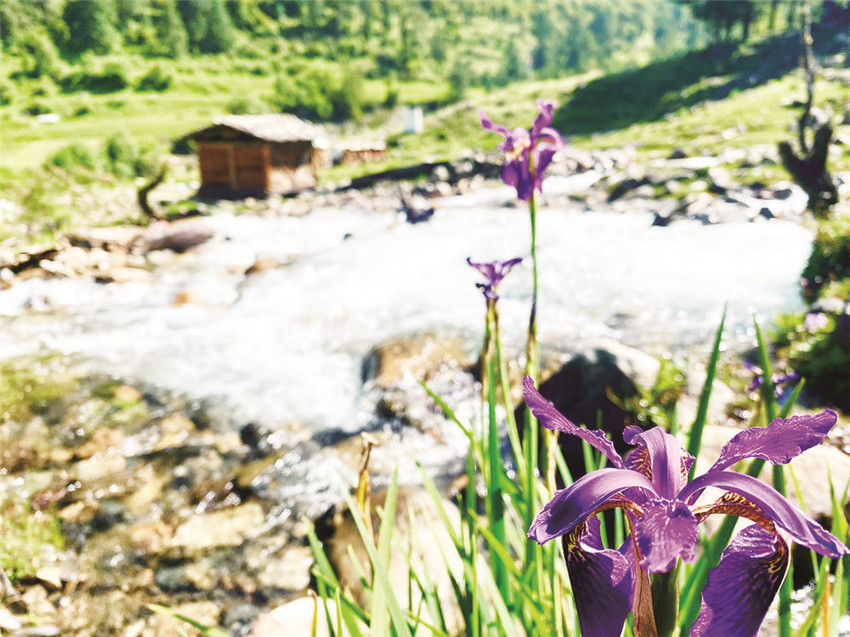 我走出木屋,朝著流動的水聲去梳洗。三兩只藍(lán)綠色的鳥兒立在插入溪水溝里的一截木槽上低頭飲水,抬頭鳴唱,見到人影,撲棱棱幾聲飛進了不遠(yuǎn)處的一片淺樹叢里,沒了蹤跡。一層薄薄的白霧正從牧場后方皺褶起伏的山頂漫溢下來,湮沒了黛青色的山石、綠色的小杜鵑樹叢,接著湮沒了整個牧場,眼前一片空茫,耳邊只有溪水婉轉(zhuǎn)流向遠(yuǎn)處的聲音。我蹲下身,把手伸進溪水里,由雪水融化的沁涼很快冷冽到了骨頭里,再往深處,觸摸到一個個光滑的圓石。浸泡久了,溪水開始變得柔軟溫暖起來,掬一捧洗臉,那清爽仿佛能使我一眼看開眼前的云霧,看清那些停立于山頂石礫之上的灰色獐子和樹叢深處悄然綻開的紫色貝母花,花瓣上星星點點的白是它與生俱來的喜色。