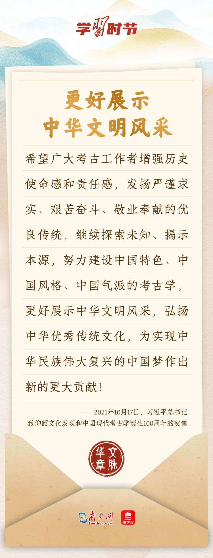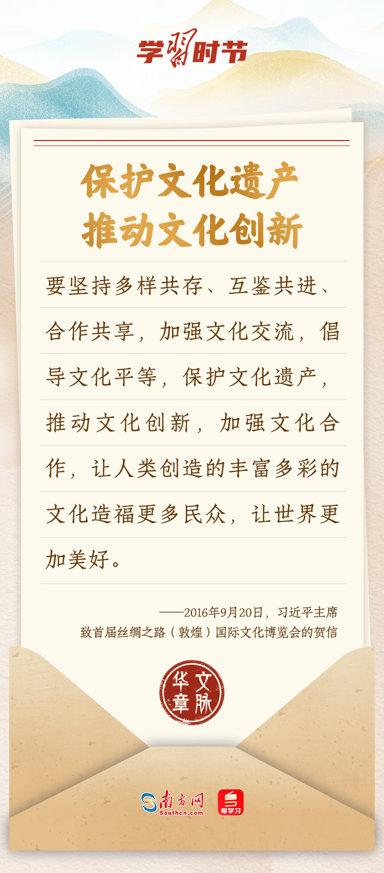 “中華民族在幾千年歷史中創(chuàng)造和延續(xù)的中華優(yōu)秀傳統(tǒng)文化,是中華民族的根和魂?!绷?xí)近平總書記多次通過發(fā)賀信、寫回信等方式,表達(dá)著對弘揚(yáng)中華優(yōu)秀傳統(tǒng)文化的殷切希望,飽含深情、字字暖心、催人奮進(jìn)。讓我們一起“讀”信。