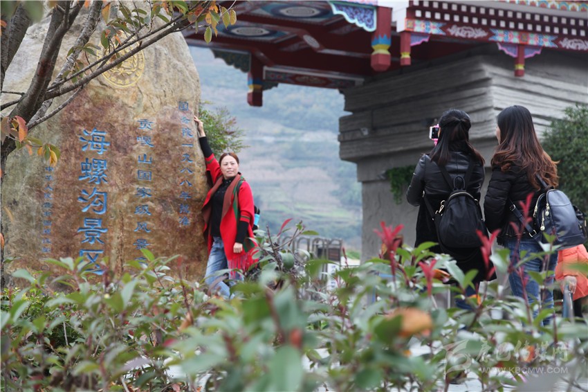海螺溝可謂處處皆風(fēng)景,圖為游客在海螺溝景區(qū)大門留影。