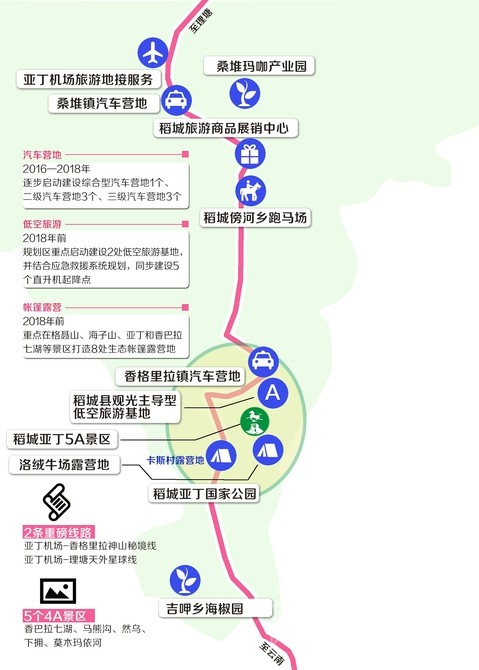根據(jù)《規(guī)劃》,將結(jié)合道路交通和旅游景區(qū)景點分布,2016—2018年,逐步啟動建設綜合型汽車營地1個、二級汽車營地3個、三級汽車營地3個,作為建設環(huán)亞丁兩小時旅游圈的重要旅游項目,滿足日益增長的自駕車游客需求。