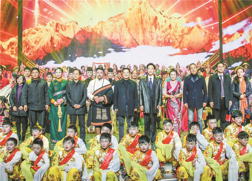 圖為劉成鳴、肖友才等州領(lǐng)導(dǎo)與全體演職人員合影留念。