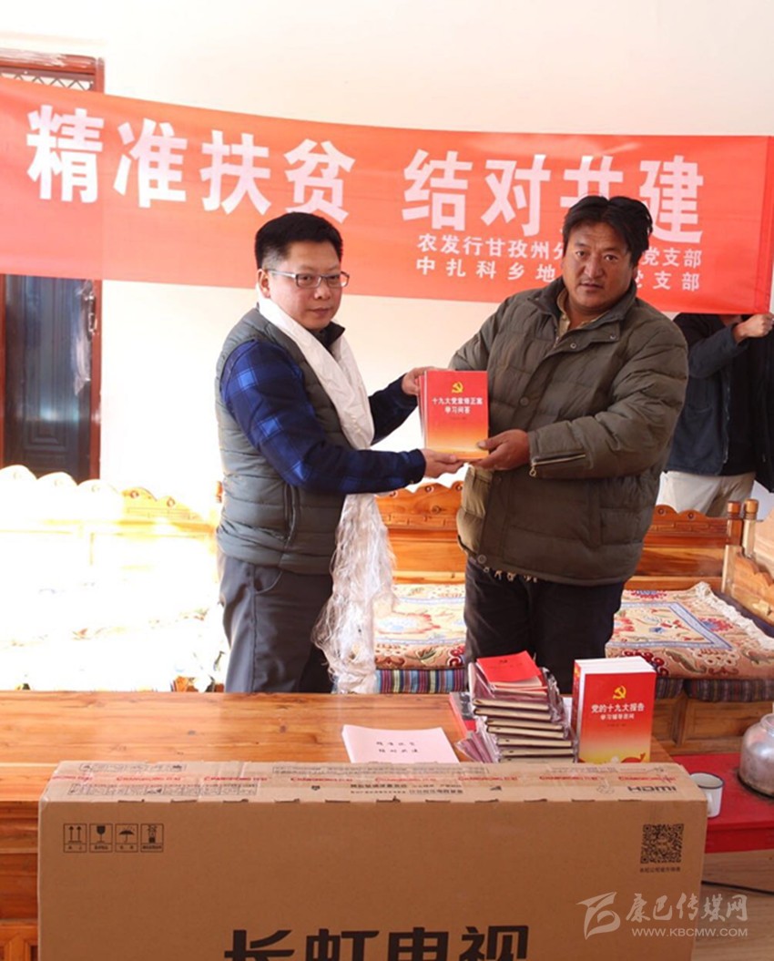 在中扎科鄉(xiāng)地龍村村級活動室,農(nóng)發(fā)行甘孜州分行工作組結(jié)合村情和幫扶實際,為當(dāng)?shù)鼗鶎痈刹亢忘h員代表宣講黨的十九大精神,共同探討產(chǎn)業(yè)扶貧新路子,并向地龍村黨員活動室捐贈了 液晶電視、黨建讀物和十九大學(xué)習(xí)專用筆記等物品。希望結(jié)對村支部能切實發(fā)揮基層黨組織在農(nóng)牧民群眾中的引領(lǐng)作用,基層黨員能加強(qiáng)責(zé)任意識和使命擔(dān)當(dāng),積極深入農(nóng)牧民群眾中發(fā)揮自身優(yōu)勢和黨員先鋒模范作用,以實際行動為群眾做出榜樣,團(tuán)結(jié)帶領(lǐng)全村群眾脫貧致富。