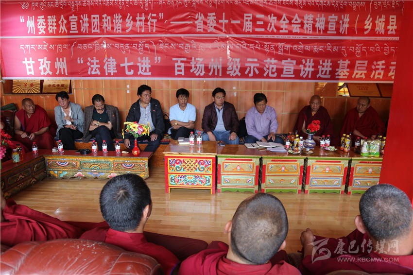 本網(wǎng)訊 按照州委統(tǒng)一安排部署,7月27日下午,州委群眾宣講團(tuán)深入色達(dá)縣色柯鎮(zhèn)東嘎寺開展了“州委群眾宣講團(tuán)和諧鄉(xiāng)村行”——省委十一屆三次全會(huì)精神暨“法律七進(jìn)”百場州級示范宣講進(jìn)基層活動(dòng)。