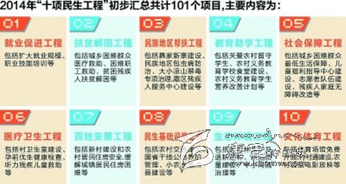在征求各級(jí)部門、基層群眾意見的基礎(chǔ)上,今年“十項(xiàng)民生工程”已初步匯總101個(gè)項(xiàng)目,主要有:就業(yè)促進(jìn)工程,包括擴(kuò)大就業(yè)規(guī)模、職業(yè)技能培訓(xùn)等;扶貧解困工程,包括城鄉(xiāng)困難群眾醫(yī)療救助、困難職工救助等;民族地區(qū)幫扶工程,包括大小涼山禁毒專項(xiàng)治理、藏區(qū)殘疾人服務(wù)中心建設(shè)等;教育助學(xué)工程,包括農(nóng)村義務(wù)教育學(xué)校食堂建設(shè)等;社會(huì)保障工程,包括志愿者隊(duì)伍建設(shè)、殘疾人家庭無障礙改造等;醫(yī)療衛(wèi)生工程,包括孕前優(yōu)生健康檢查、聽力殘疾兒童救助等;百姓安居工程,包括農(nóng)村居民住房安全、緩解城鎮(zhèn)居民住房困難等;民生基礎(chǔ)設(shè)施工程,包括國(guó)省干線公路養(yǎng)護(hù)管理等;生態(tài)環(huán)境工程,包括耕地質(zhì)量建設(shè)、中小河流治理等;文化體育工程,包括體育場(chǎng)館免費(fèi)開放等。