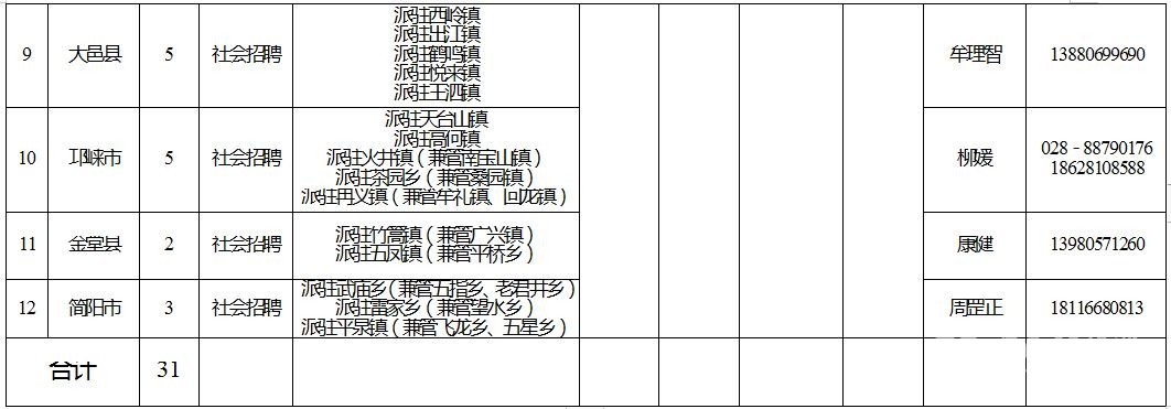 1﹒社會(huì)招聘招募區(qū)(市)縣:成都天府新區(qū)、新都區(qū)、郫都區(qū)、簡陽市、都江堰市、彭州市、邛崍市、崇州市、金堂縣、新津縣、大邑縣、蒲江縣(具體信息詳見附件1)。