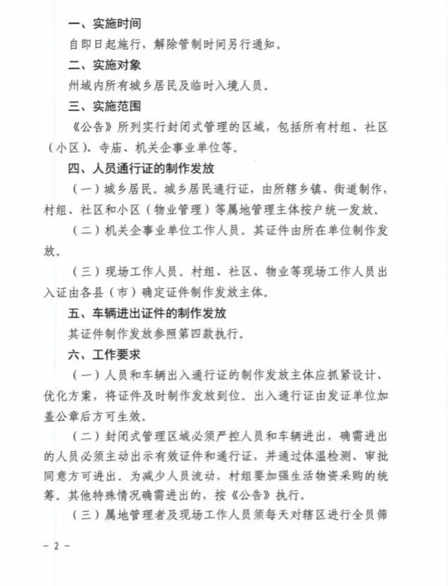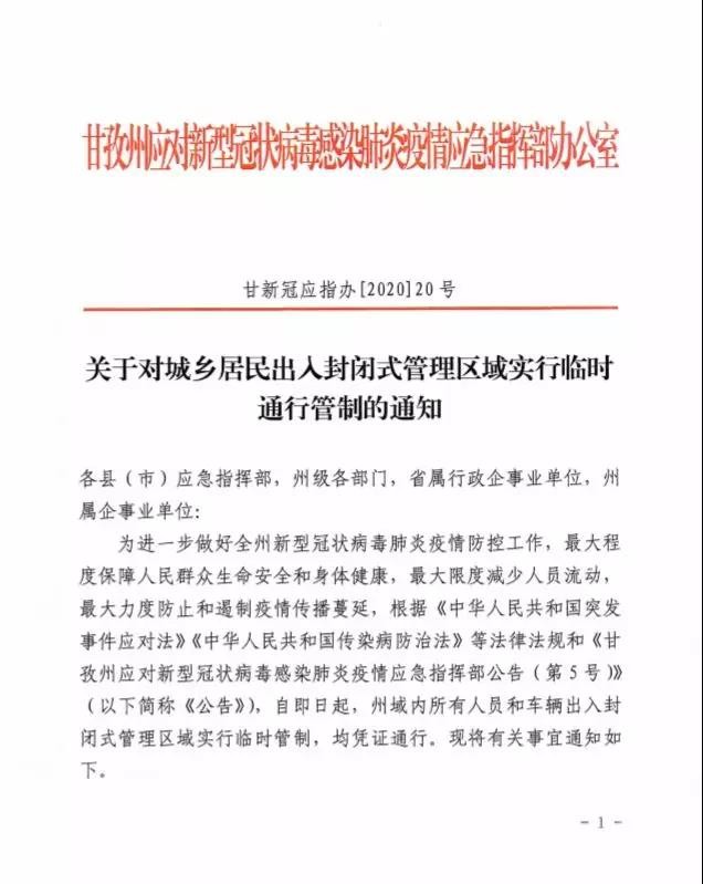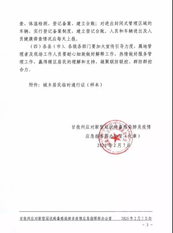 為進一步做好全州新型冠狀病毒肺炎疫情防控工作,最大程度保障人民群眾生命安全和身體健康,最大限度減少人員流動最大力度防止和遏制疫情傳播蔓延,根據(jù)《中華人民共和國突發(fā)事件應(yīng)對法》《中華人民共和國傳染病防治法》等法律法規(guī)和《甘孜州應(yīng)對新型冠狀病毒感染肺炎疫情應(yīng)急指揮部公告(第5號)》(以下簡稱《公告》),自即日起,州域內(nèi)所有人員和車輛出入封閉式管理區(qū)域?qū)嵭信R時管制,均憑證通行。現(xiàn)將有關(guān)事宜通知如下。