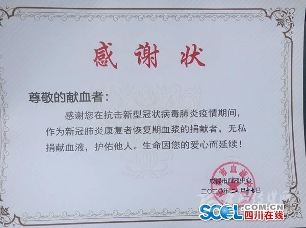 “出院的時候,我特地與我的主治醫(yī)生說,有相關(guān)的血液捐贈或者其他配合的需求請隨時聯(lián)系我!”35歲的捐獻者李某表示,這是我首次獻血,我是湖北武漢人,有親戚朋友在成都,當作成都是第二故鄉(xiāng),我是1月22日到成都探親,23日下午發(fā)熱在成都市公共衛(wèi)生臨床醫(yī)療中心確診和治療,2月6日出院。在出院治療期間,李某表示,最難忘的就是每次醫(yī)生來查房,都會鼓勵我說,放心你一定會康復的,“我難忘成都這份恩情!”