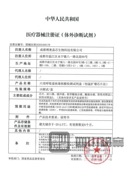 2月22日,國家藥品監(jiān)督管理局應(yīng)急審批通過3個新型冠狀病毒檢測產(chǎn)品,其中之一的“六項呼吸道病毒核酸檢測試劑盒”就是鐘院士提到的試劑,而它則是由位于成都溫江的企業(yè)——博奧生物聯(lián)合清華大學(xué)、四川大學(xué)華西醫(yī)院共同設(shè)計開發(fā)的。這款產(chǎn)品正在迅速應(yīng)用到疫情防控前線,為一線提供快速、精準、有效診斷。