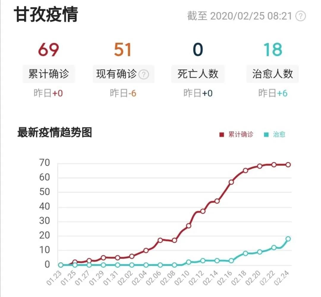 截止2月24日24時,我州累計報告新型冠狀病毒肺炎確診病例69例(道孚64例、康定2例、色達2例、稻城1例),其中累計治愈出院18例(道孚縣13例、康定市2例、色達縣2例、稻城縣1例),在治重癥5例,危重癥1例,其余患者病情穩(wěn)定,均在定點醫(yī)院接受治療。其中,男性39例,女性30例,最大的77歲,最小的3歲。累計確診病例中:5人有武漢旅居史,1人從雅安返回,2人從成都返回,1人從西藏返回、60人為道孚縣常住人口。尚在接受隔離醫(yī)學觀察的密切接觸者341人。各縣(市)確診病例情況表